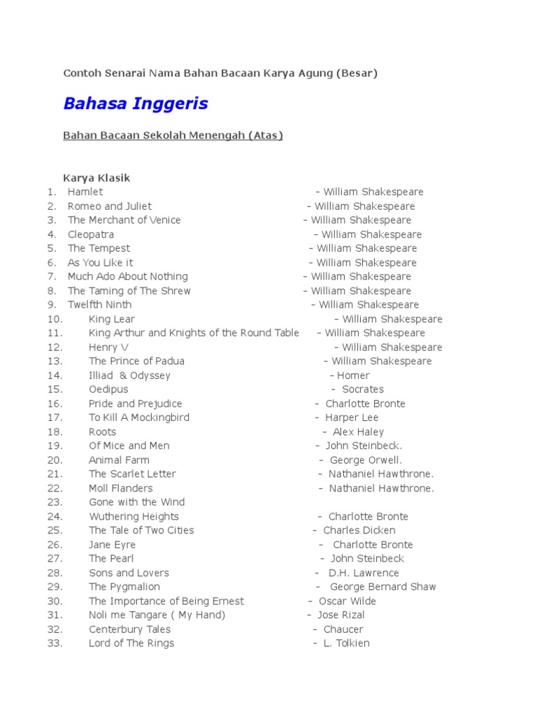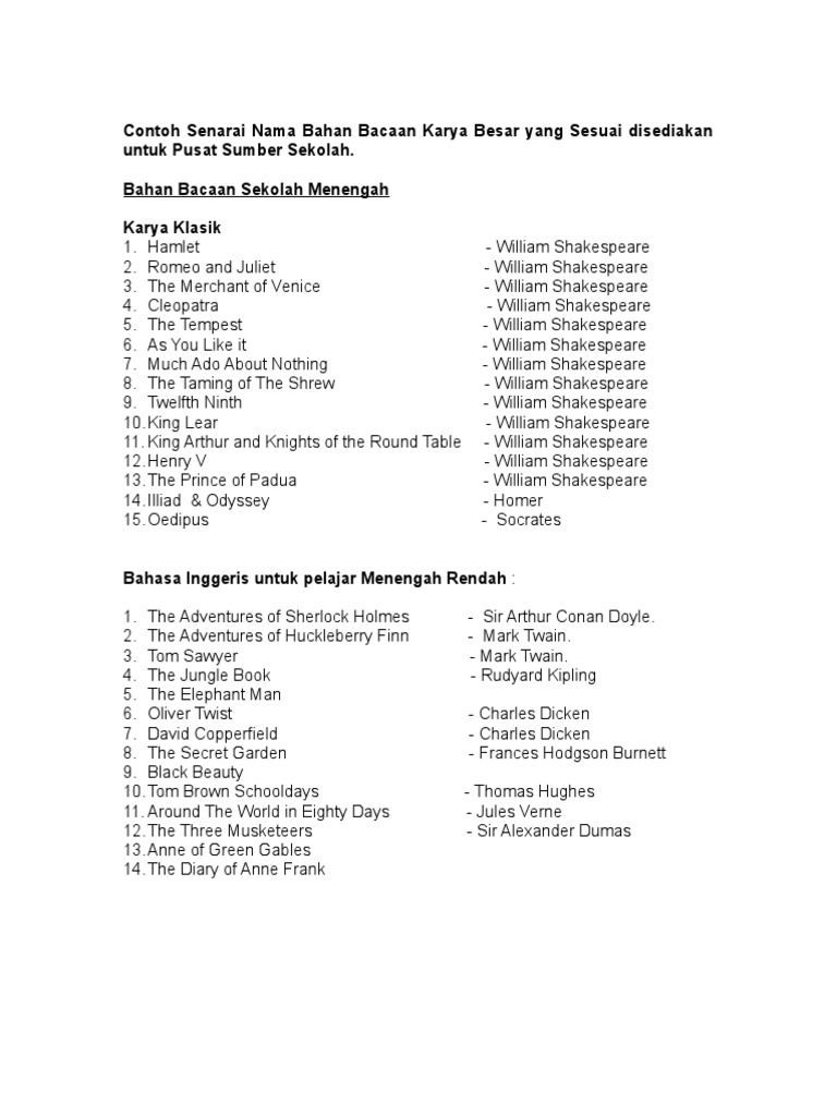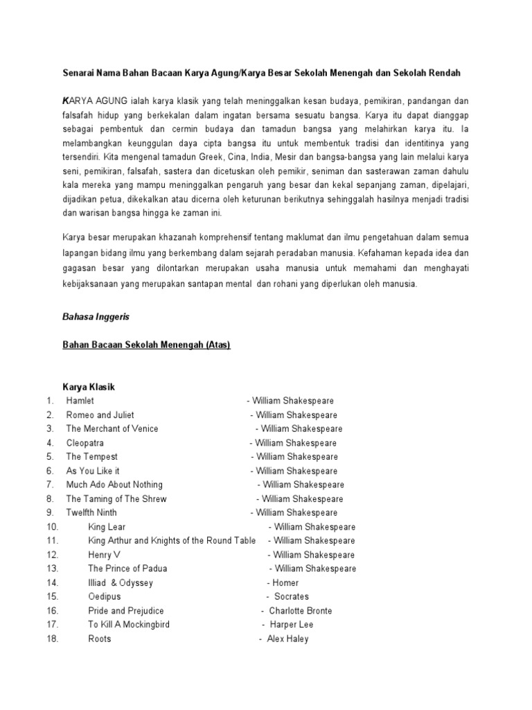 Senarai Nama Bahan Bacaan Karya Agung Pdf