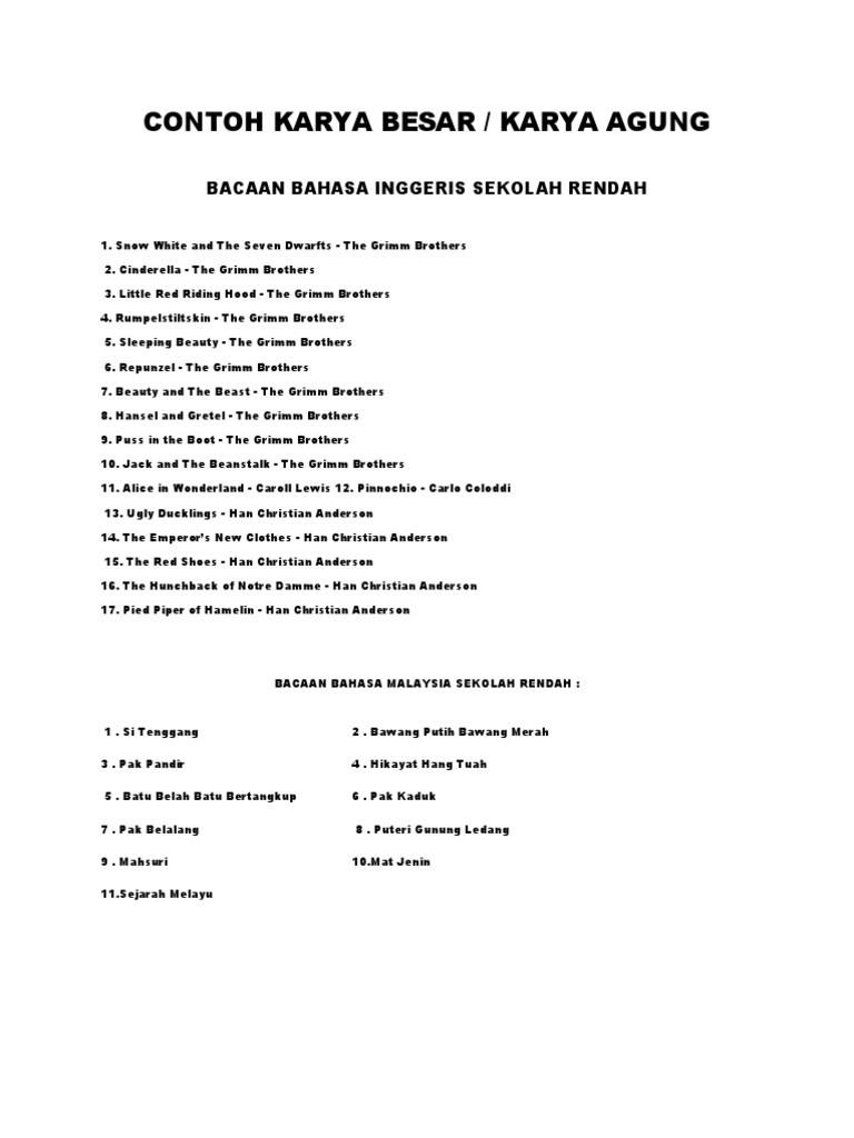 Senarai Nama Bahan Bacaan Karya AgungKarya Besar Sekolah Rendah. Buku ini meliputi senarai penggunaan ICT daripada yang praktikal dan dirancang dengan teliti hinggalah kepada yang menyeronokkan dan inovatif serta merangkumi. Modul bahasa melayu versi penuh juga ada disediakan.